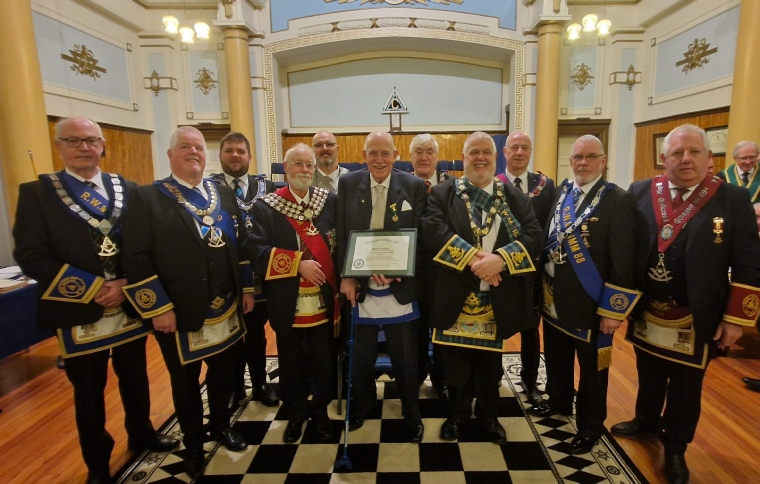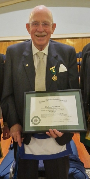 Brother Sir Boyd Tunnock received his Platinum Certificate from the Grand Lodge of Scotland at the Regular Meeting of the Lodge on Wednesday 26th. March 2025.