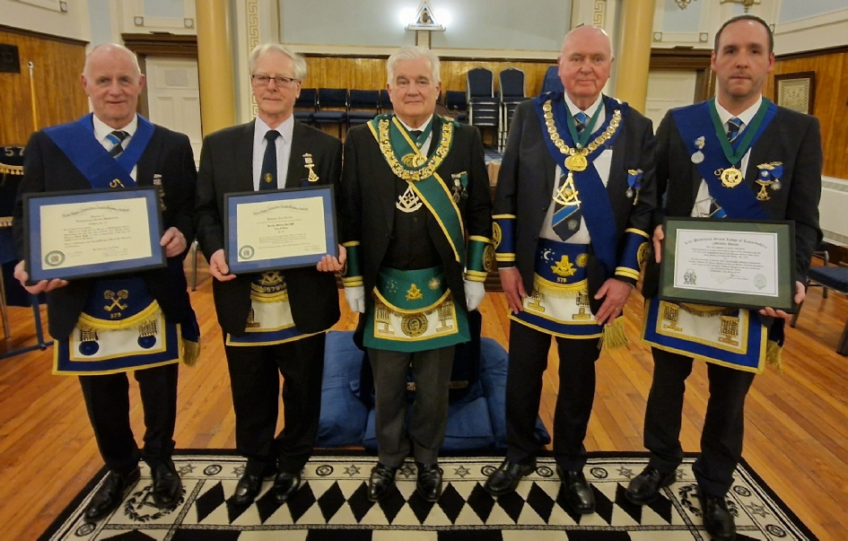 William Hall, Past Master, Jubilee Certificate, David Shaw, Past Master Distinguished Service Membership, Stuart Jack, Past Master Honorary Provincial Grand Librarian, with Bro. Andrew D. Millar, Provincial Grand Master and Bro. James Vasey, RWM.